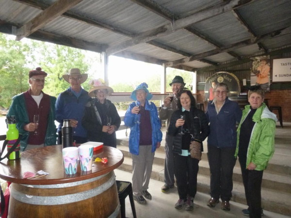 Enroute, the sunshine disappeared and the clouds became larger, greyer more threatening and loud with thunder. However, with a varying amount of ‘caught in the rain’ the group reached Pfeiffer’s and enjoyed the shared afternoon tea with, you guessed it ‘Çup Cakes’, and lots of bubbles under the large verandah at the barrel and high tables.